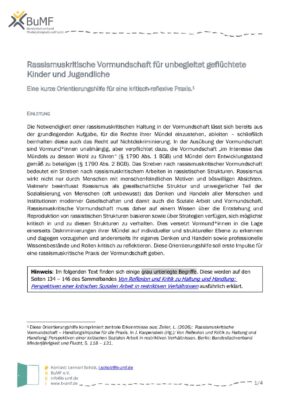 Rassismuskritische Vormundschaft muss auf einem Wissen über die Entstehung und Reproduktion von rassistischen Strukturen basieren sowie über Strategien verfügen, sich möglichst kritisch in und zu diesen Strukturen zu verhalten. Diese Orientierungshilfe soll erste Impulse für eine rassismuskritische Praxis der Vormundschaft geben.