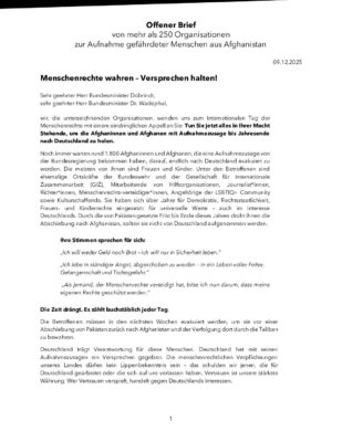 Zum Tag der Menschenrechte: Offener Brief von mehr als 250 Organisationen zur Aufnahme gefährdeter Menschen aus Afghanistan.